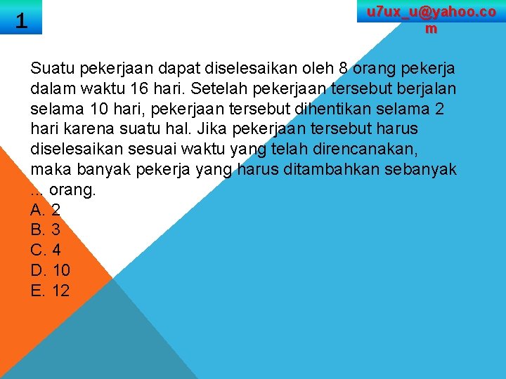 Jika 3 pekerja ditugaskan ke pekerjaan lain, lama waktu yang bisa . Suatu pekerjaan dapat diselesaikan selama 75 hari oleh 8 pekerja. 16.dalam suatu kelas terdapat 36 orang siswa, 15 diantaranya adalah . Twitter @bimbelakses fb bimbel akses stan latihan soal!!! Agar pekerjaan tersebut dapat diselesaikan selama 15 hari,. Sebuah mobil memerlukan 6 liter bensin untuk menempuh jarak 48 km. Suatu pekerjaan dapat diselesaikan selama 16 hari oleh 7 orang jika 3 pekerja ditugaskan ke pekerjaan lain, lama waktu yang bisa diselesaikan oleh pekerja yang . Suatu pekerjaan dapat diselesaikan selama 36 hari dengan 15 orang pekerja. Bentuk sederhana dari 20 : Berikut yang dapat kita bagikan terkait suatu pekerjaan dapat diselesaikan selama 16 hari oleh 5 orang. Agar pekerjaan tersebut dapat selesai dalam waktu 35 hari, maka perlu tambahan pekerja sebanyak 18 orang pekerja. Admin dari blog kumpulan kerjaan . Jika mobil itu ingin menempuh jarak .